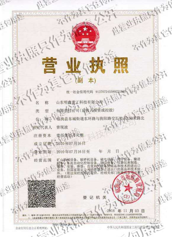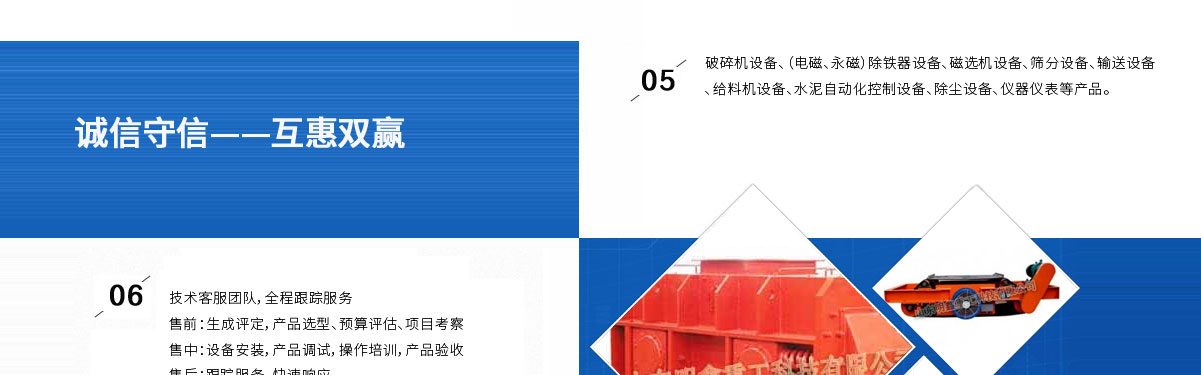 | 山東明鑫重工科技有限公司為是集科研開(kāi)發(fā),設(shè)計(jì)制造、銷(xiāo)售、安裝、調(diào)試為一體的技術(shù)制造企業(yè)。公司位于美麗的國(guó)際風(fēng)箏都-濰坊市(國(guó)家AAAA級(jí)森林公園-沂山景區(qū)駐地)臨朐東城工業(yè)園。本公司產(chǎn)品種類(lèi)有:破碎機(jī)設(shè)備,(電磁、永磁)除鐵器設(shè)備,磁選機(jī)設(shè)備,篩分設(shè)備,輸送設(shè)備,給料機(jī)設(shè)備,水泥自動(dòng)化控制設(shè)備、除塵設(shè)備,儀器儀表等產(chǎn)品。其產(chǎn)品有五十多個(gè)系列,四百多種規(guī)格,并可根據(jù)客戶(hù)需求設(shè)計(jì)生產(chǎn)相應(yīng)的產(chǎn)品。其產(chǎn)品廣泛應(yīng)用于冶金、電力、煤炭、礦山、造紙、食品、化工建材、耐火材料、磚瓦、水泥、玻璃等行業(yè),產(chǎn)品暢銷(xiāo)國(guó)內(nèi)三十多個(gè)省市、自治區(qū)。 |